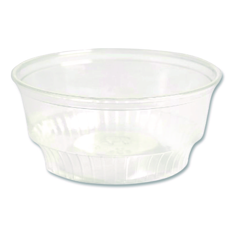 Outstanding clear cups ideal for cold beverages, on-the-go snacks, ice cream or breakfast parfaits and other light snacks. Convenient for breakrooms and kitchens. Stackable. Sundae Cup. Cup Type: Cold Cup; Interior Volume Capacity: 5 oz; Material(s): Polyethylene Terephthalate (PET); Material Type: Plastic.