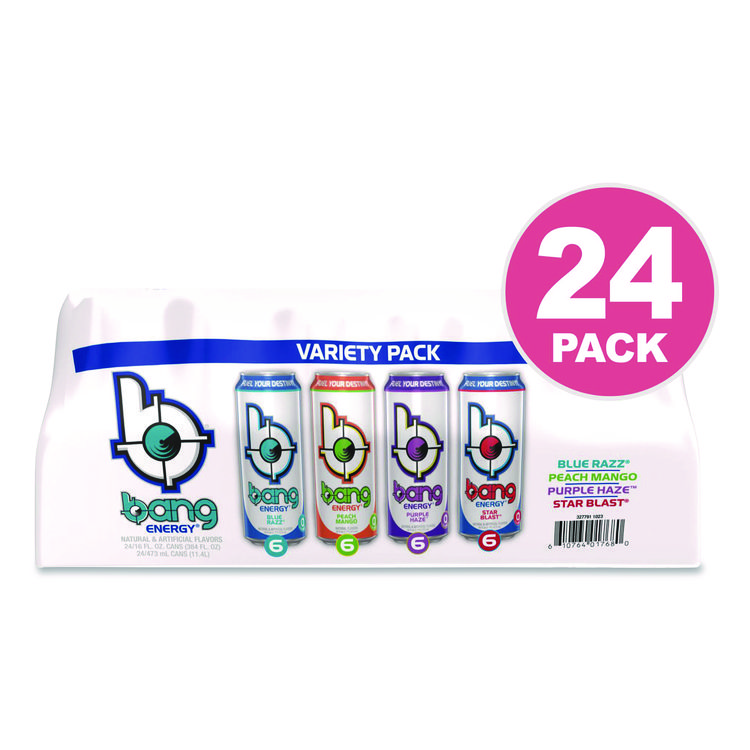 Energy drinks that offer zero sugar, no calories, no carbs and no artificial coloring. Every 16-ounce can of Bang, that's right, no wimpy 12-ounce cans here, contains 300 milligrams of caffeine, which has been shown to increase endurance, as well as strength in some cases. Even better, Bang is sugar-free and has ZERO calories, yet it tastes great, with a variety of fantastic flavors to choose from! Bang energy drinks also contain other ingredients designed to help you get more out of your workout, your day and your life. Beverage Type: Energy; Flavor: Assorted; Product Packaging: Can; Volume Capacity: 16 oz.