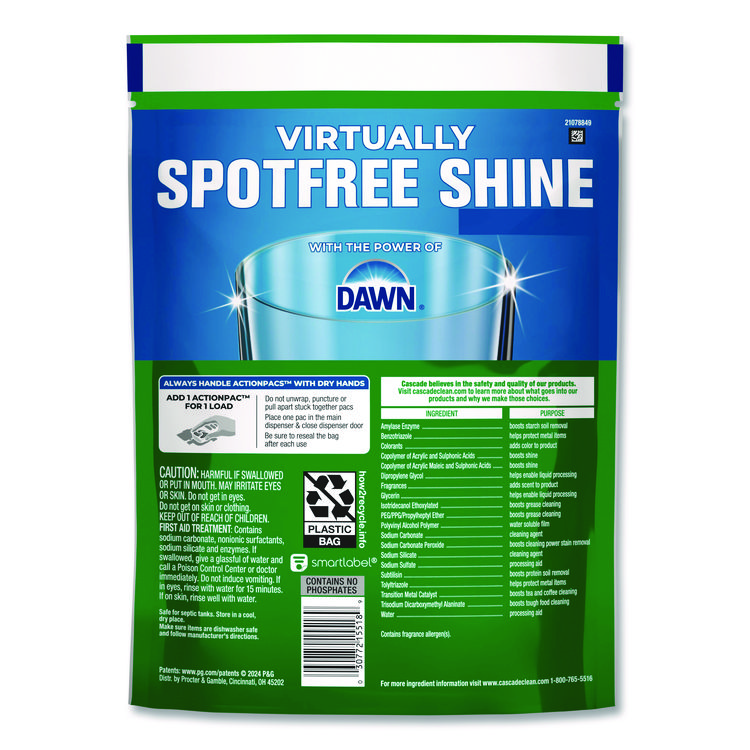 Cascade ActionPacs dishwasher detergent powers away greasy residue for sparkling dishes. That's because every ActionPac combines the scrubbing power of Cascade and the grease-fighting power of Dawn dishwashing liquid to leave your dishes virtually spotless. Cascade ActionPacs are conveniently premeasured with no finicky wrapping-simply load your dishwasher, pop in an ActionPac, and go! Application: Machine Dishwashing; Applicable Material: Ceramic; Glass; Metal; Plastic; Chemical Compound: Amylase Enzyme; Benzotriazole; Colorants; Copolymer of Acrylic And Sulphonic Acids; Copolymer of Acrylic Maleic And Sulphonic Acids; Dipropylene Glycol; Fragrances; Glycerin; Isotridecanol Ethoxylated; PEG/PPG/Propylheptyl Ether; Polyvinyl Alcohol Polymer; Sodium Carbonate; Sodium Carbonate Peroxide, Sodium Silicate; Sodium Sulfate; Subtilisin; Tolyltriazole; Transition Metal Catalyst; Trisodium Dicarboxymethyl Alaninate; Water; Dirt Types: Cooked-On Grease; Dirt; Food Particles; Organic Matter.