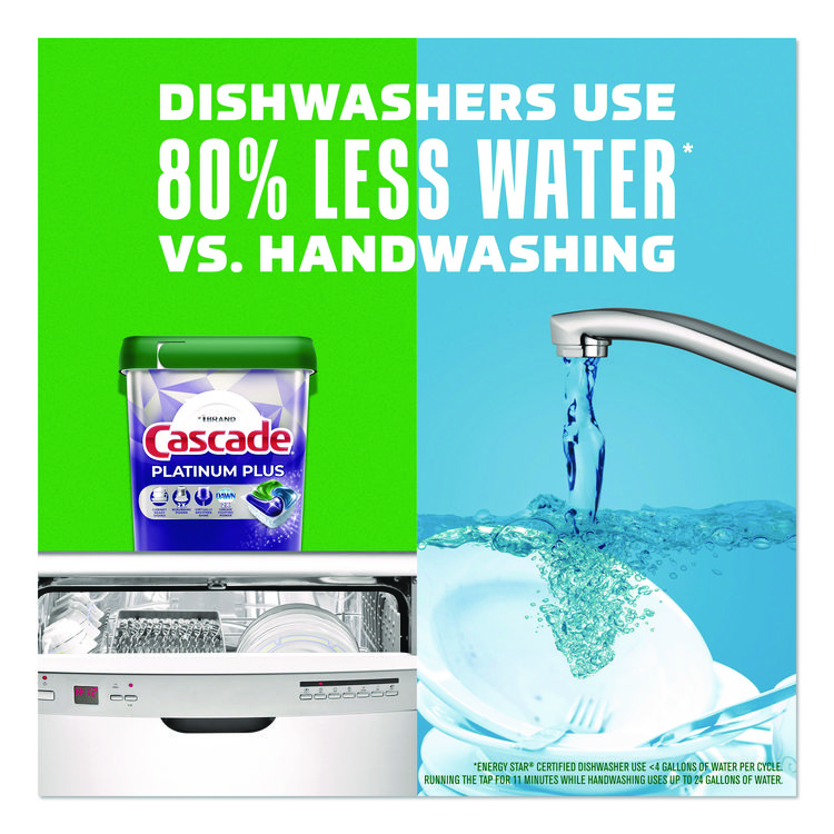 Cascade ActionPacs dishwasher detergent powers away greasy residue for sparkling dishes. That's because every ActionPac combines the scrubbing power of Cascade and the grease-fighting power of Dawn dishwashing liquid to leave your dishes virtually spotless. Cascade ActionPacs are conveniently premeasured with no finicky wrapping-simply load your dishwasher, pop in an ActionPac, and go! Platinum™ ActionPacs®—With a premium advanced triple action formula. Application: Machine Dishwashing; Applicable Material: Ceramics; Enamel; Fiberglass; Glass; Metal; Plastic; Chemical Compound: Amylase Enzyme; Benzotriazole; Colorants; Copolymer Of Acrylic And Sulphonic Acids; Dipropylene Glycol; Fragrances; Glycerin; Isotridecanol Ethoxylated; PEG/PPG/Propylheptyl Ether; Polyvinyl Alcohol Polymer; Sodium Carbonate; Sodium Carbonate Peroxide; Sodium Sulfate; Subtilisin; Tolyltriazole; Transition Metal Catalyst; Trisodium Dicarboxymethyl Alaninate; Water; Dirt Types: Cooked-On Grease; Food Particles; Oils; Organic Matter; Soil.