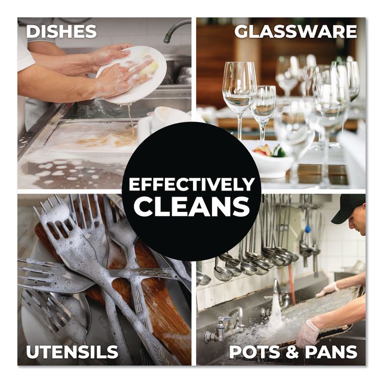 Simple Green PRO Dish Soap is a heavy-duty manual pot, pan and glassware dishwashing liquid. Long-lasting suds cut through even the toughest grease, grime and stuck-on food with less scrubbing. The cost-effective concentrate leaves your dishes clean, shiny and ready for use. Ideal for high-volume kitchen settings such as restaurants, bars, cafeterias, food trucks, commercial kitchens, bakeries, coffee shops, lunchrooms and more. Works great in three-compartment sinks or any dishwashing station. Contains no phosphates or parabens. Concentrated formula requires just 2 oz of dish soap per 10 gallons of water. Application: Hand Dishwashing; Applicable Material: Dishes; Glassware; Pans; Pots; Utensils; Chemical Compound: Aqueous Based Mixture; Dirt Types: Grease; Grime; Food.