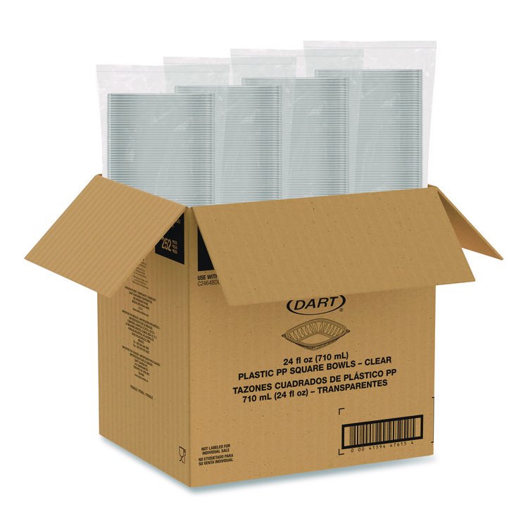These square bowls not only look great, they make merchandising and delivering food easy. Our bowls are perfect for takeout, delivery, grocery stores and cafeterias. Worry less about messes and spills thanks to the durable, crack-resistant design. Pair with a compatible lid (sold separately), for a reliable and leak-resistant combination. No matter what's inside—from saucy pastas to salads loaded with toppings and dressings—these containers keep food fresh and mess-free! Food Container Type: Base; Material(s): PP - Polypropylene; Material Type: Plastic; Interior Volume Capacity: 24 oz.