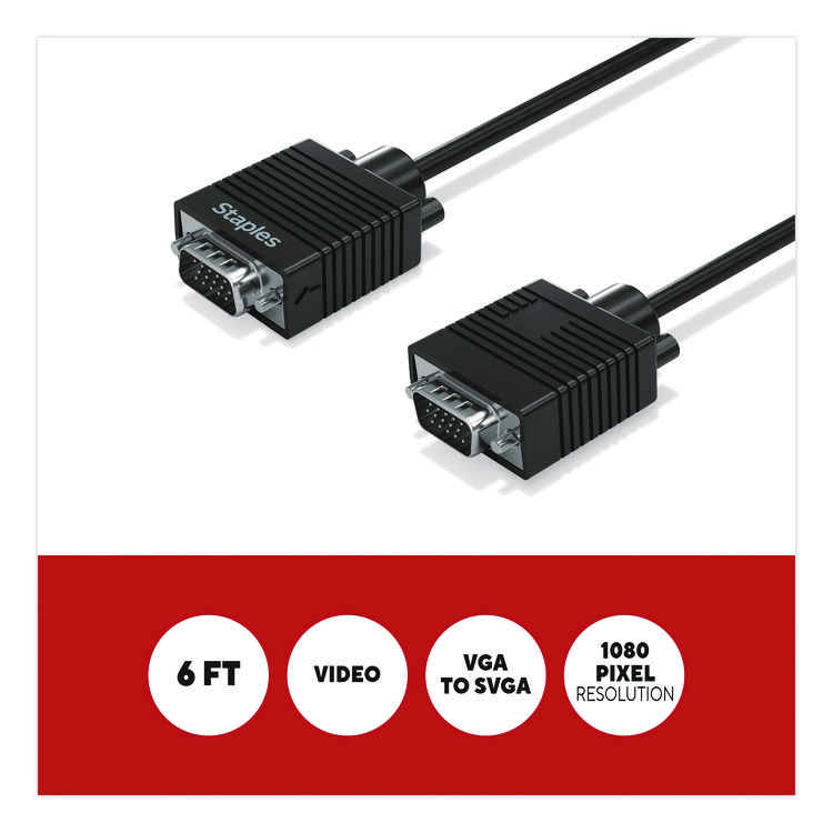 For work or entertainment an extra, larger display often comes in handy. With the Staples TECH VGA cable, you can connect additional monitors, displays, gaming consoles, projectors and more. Delivering a clear 1080 pixel resolution, this cable promises clear video for an exceptional experience. It provides ample length to connect devices across your workspace while also reducing cord clutter. This cable is the perfect choice for outfitting your work, gaming or entertainment space. Enjoy quality video so you can upgrade your home or office workspace and do your best work. Cable Type: SVGA Cable; Connector/Port/Interface: SVGA Male; VGA Male; Cable Length: 6 ft; Jacket Color: Black.